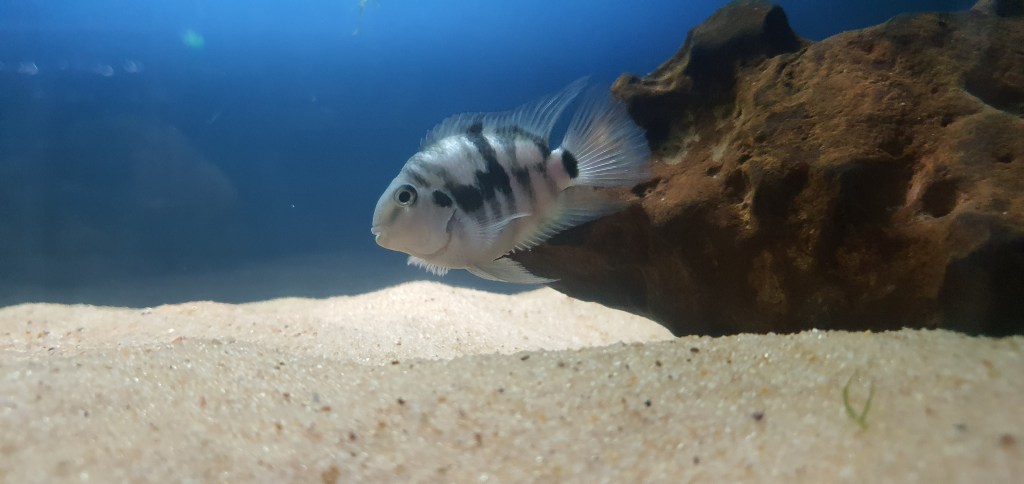 - Variedades: No hay muchas variedades de color de convictos. El pez convicto suele ser de color marrón oscuro con rayas verticales negras y una mancha negra en la parte superior de su aleta dorsal. Sin embargo, también hay variedades de convictos albinos, dorados y azules, entre otros