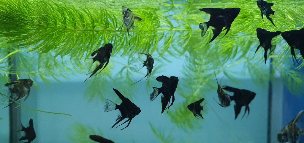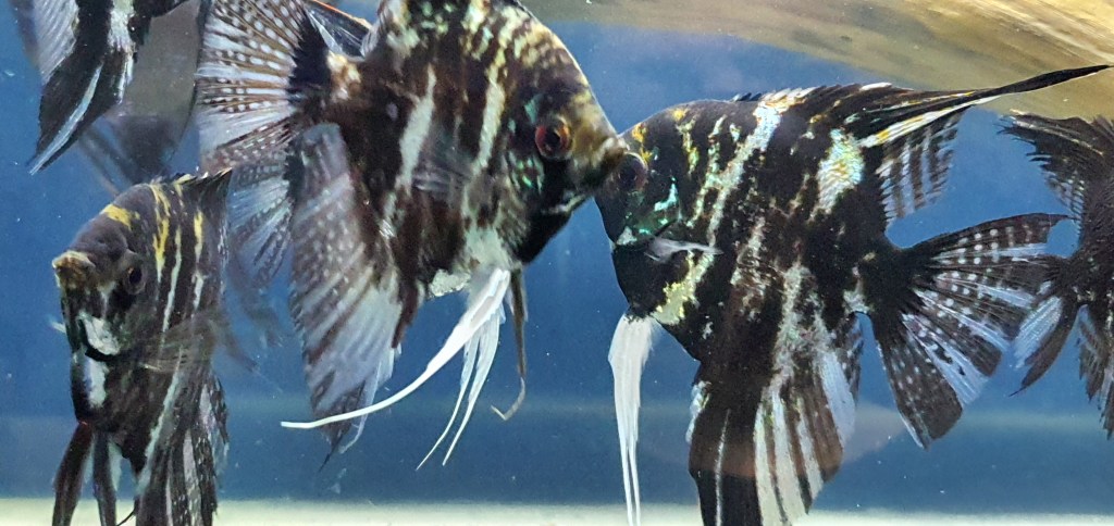 - Variedades: Existen variedades de color de escalares, como el clásico escalares con rayas plateadas y negras, pero también hay escalares con manchas, con patrones de mármol y de color dorado, entre otros.
